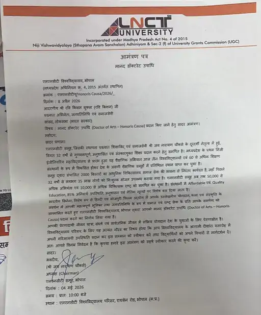 लखनऊ। कला, अभिनय और जनसेवा के क्षेत्र में विशिष्ट पहचान बनाने वाले गोरखपुर के सांसद व लोकप्रिय अभिनेता रवि किशन शुक्ला के नाम एक और बड़ी उपलब्धि जुड़ने जा रही है। मध्य प्रदेश की राजधानी भोपाल स्थित एलएनसीटी (LNCT) विश्वविद्यालय ने उन्हें ‘मानद डॉक्टरेट’ (Doctor of Arts – Honoris Causa) की उपाधि से विभूषित करने का निर्णय लिया है।