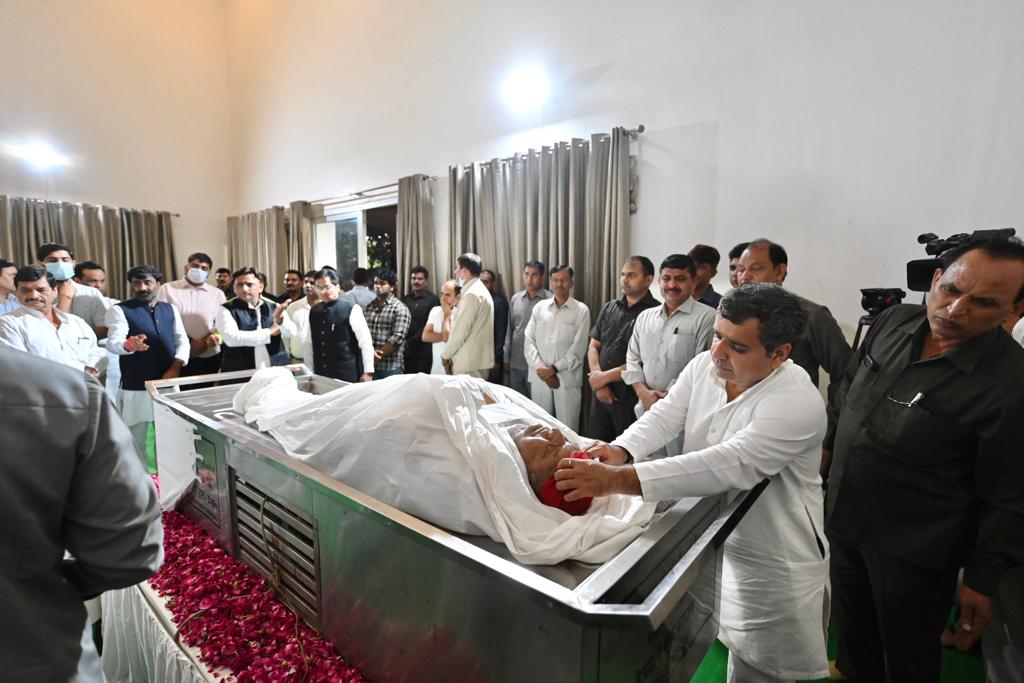 भावुक भाव के साथ पिता मुलायम सिंह यादव के पार्थिव शरीर को देखते अखिलेश यादव, इस दौरान उनके साथ शिवपाल यादव भी मौजूद।