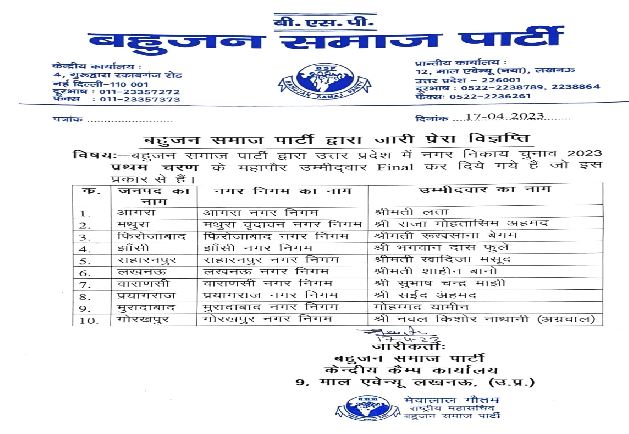 - मायावती ने मेयर प्रत्याशियों की सूची जारी की