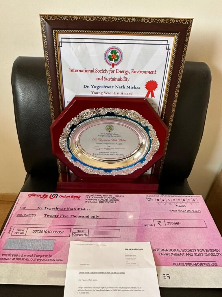 नासा के वैज्ञानिक योगेश्वर नाथ मिश्रा को आईआईटी कानपुर में इंटरनेशनल सोसाइटी ऑफ एनर्जी एनवायरनमेंट एंड सस्टेनेबिलिटी (ISEES) द्वारा यंग साइंटिस्ट अवार्ड 2023 से सम्मानित किया गया है। यह प्रतिष्ठित पुरस्कार उन्हें 4-6 दिसंबर 2023 को एमएनआईटी जयपुर में सोसायटी के 8वें अंतर्राष्ट्रीय सम्मेलन में दिया गया था।