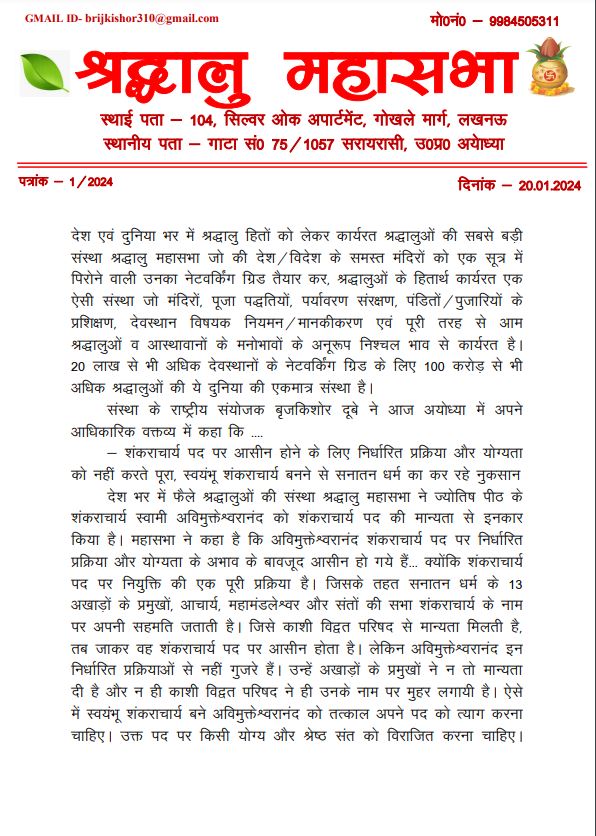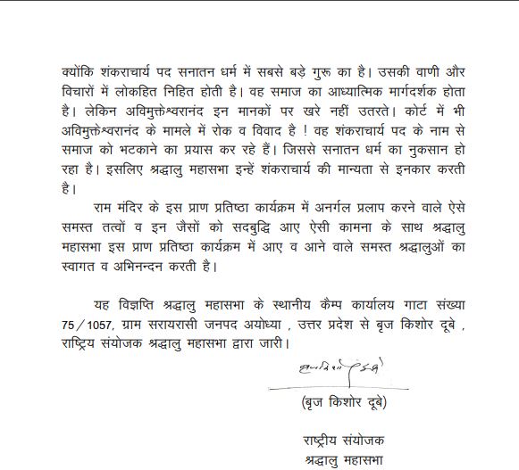 वहीं उन्होंने आगे कहा की अविमुक्तेश्वरानंद इन मानकों पर खरे नहीं उतरते। कोर्ट में भी अविमुक्तेश्वरानंद के मामले में रोक व विवाद है। वह शंकराचार्य पद के नाम से समाज को भटकाने का प्रयास कर रहे हैं। जिससे सनातन धर्म का नुकसान हो रहा है। इसलिए श्रद्धालु महासभा इन्हें शंकराचार्य की मान्यता से इनकार करती है। राम मंदिर के इस प्राण प्रतिष्ठा कार्यक्रम में अनर्गल प्रलाप करने वाले ऐसे समस्त तत्वों व इन जैसों को सदबुद्धि आए ऐसी कामना के साथ श्रद्धालु महासभा इस प्राण प्रतिष्ठा कार्यक्रम में आए व आने वाले समस्त श्रद्धालुओं का स्वागत व अभिनन्दन करती है.