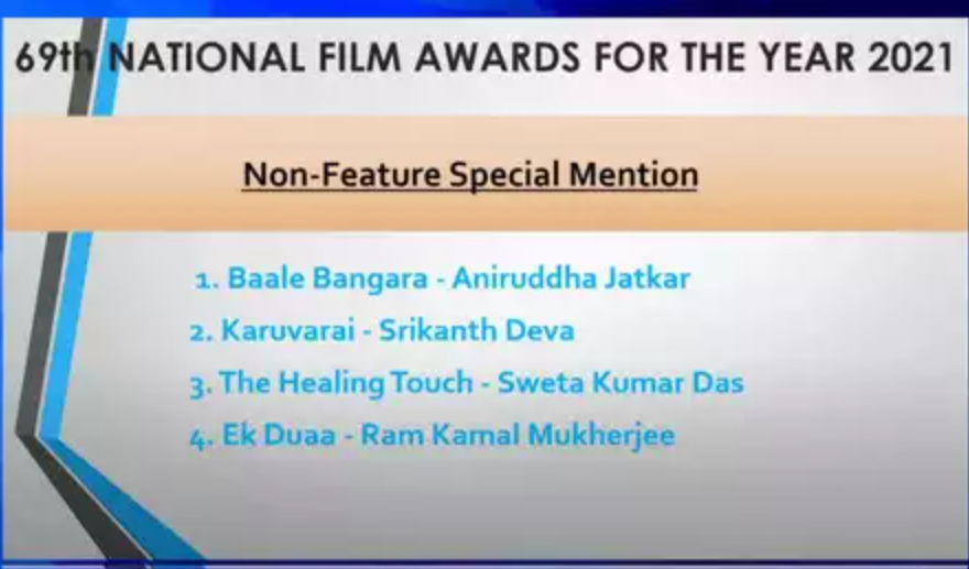 24 अगस्त को नई दिल्ली में 69वें राष्ट्रीय फिल्म पुरस्कार का ऐलान किया गया. ये पुरस्कार फीचर फिल्म में 31 श्रेणियों, गैर-फीचर फिल्म में 24 श्रेणियों और भारतीय सिनेमा में सर्वश्रेष्ठ लेखन में तीन श्रेणियों में दिए जा रहे हैं. साल 2021 के लिए, 28 भाषाओं में 280 फीचर फिल्में, 23 भाषाओं में 158 गैर-फीचर प्रविष्टियां और संविधान की आठवीं अनुसूची में निर्दिष्ट भाषाओं के अलावा 14 भाषाओं में फिल्में भी प्राप्त हुईं. सिनेमा में सर्वश्रेष्ठ लेखन के लिए 22 किताबें और 11 फिल्म समीक्षक प्रतिस्पर्धा में थे.