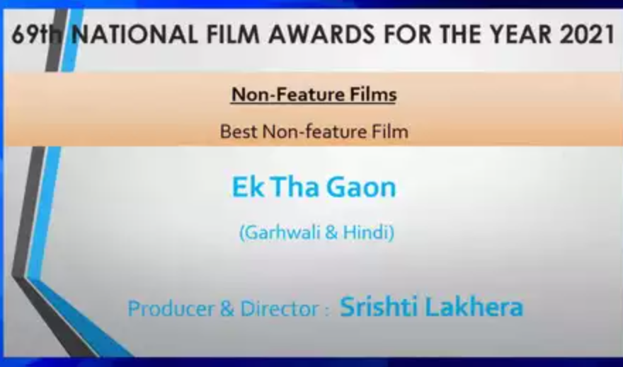 गढ़वाली और हिंदी फिल्म ‘एक था गांव’ को सर्वश्रेष्ठ गैर-फीचर फिल्म का पुरस्कार मिला. इस फिल्म की प्रोड्यूसर-डायरेक्टर सृष्टि लखेरा है. यह फिल्म दो महिलाओं के बारे में है जो हिमालय की तलहटी पर स्थित एक गाँव की एकमात्र जीवित निवासी हैं. दोनों महिलाएं अपना घर छोड़ने या अपनी जड़ों से जुड़े रहने के विचार के बीच उलझी हुई हैं. इसे इस साल ऑल लिविंग थिंग्स एनवायर्नमेंटल फिल्म फेस्टिवल (ALTEFF) में प्रदर्शित किया गया था.