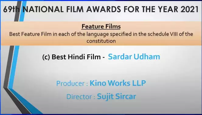 बेस्ट हिंदी फिल्म का अवार्ड विक्की कौशल की फिल्म सरदार उधम सिंह को मिला. किनो वर्क्स एलएलपी इस फिल्म के प्रोड्यूसर हैं, जबकि सुजीत सिरकर के डायरेक्शन में यह फिल्म बनी है.