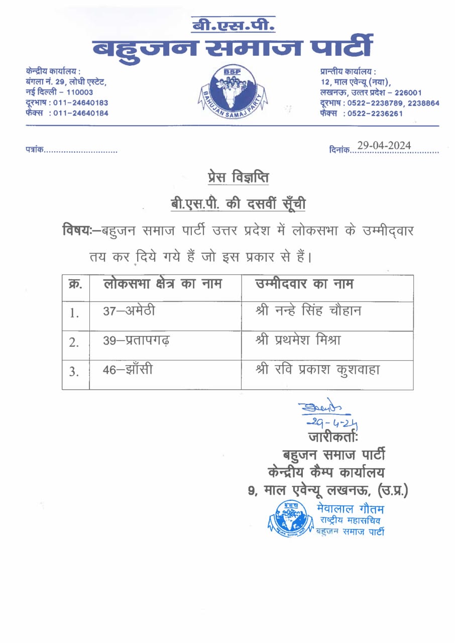 बसपा के लोकसभा प्रत्याशियों की नई लिस्ट जारी, अमेठी से बदला प्रत्याशी तो प्रतापगढ़ से प्रथमेश मिश्रा पर लगाया दांव