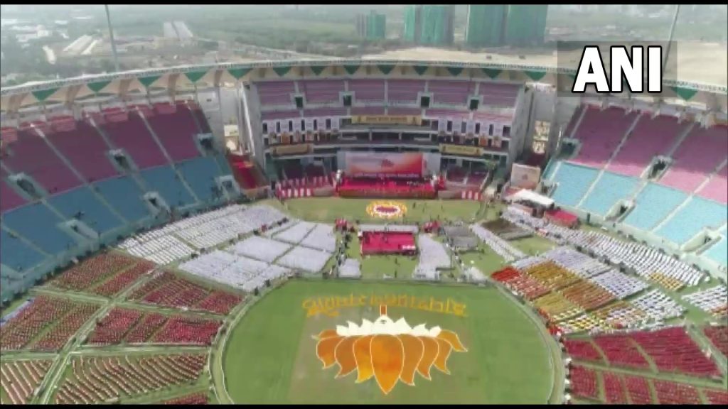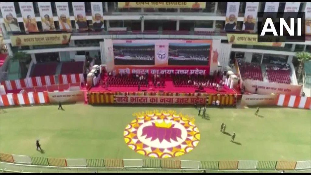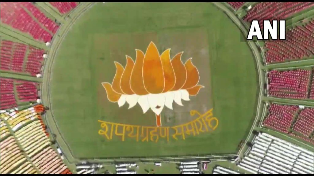 शपथ समारोह के लिए यूपी के इकाना स्टेडियम में फूलो की भव्य कलाकृति।