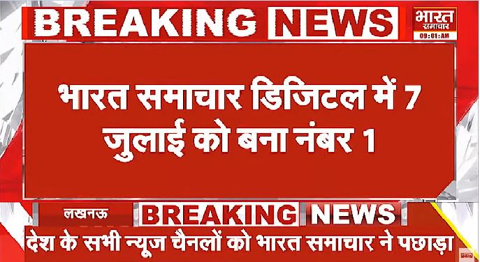 7 जुलाई को भारत समाचार डिजिटल 4.1 मिलियन लोगों तक पहुंचा. जबकि इसके मुकाबले अन्य राष्ट्रीय चैनल काफी पीछे दिखे. अपने चैनल भारत समाचार को इस मुकाम तक पहुंचाने के लिए भारत समाचार परिवार आप सभी दर्शकों का आभार व्यक्त करता है, साथ ही हम आप सभी को भरोसा दिलाते हैं कि जो विश्वास हम पर जताया है उसे कायम रखने के लिए हम जी तोड़ मेहनत करते रहेंगे. आप सभी का आभार.