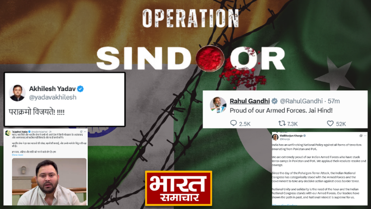 बिहार के पूर्व उपमुख्यमंत्री और राजद नेता तेजस्वी यादव ने वीडियो शेयर कर कहा: “आतंकवाद और अलगाववाद को हिंदुस्तान बर्दाश्त नहीं करेगा। हम भारतीय कभी गलत नहीं करते, लेकिन अगर कोई हमारे साथ गलत करता है तो हम सहते भी नहीं।” “140 करोड़ भारतवासी भारतीय सेना और सरकार के साथ खड़े हैं। हिंदुस्तान जिंदाबाद, भारतीय सेना जिंदाबाद, जय हिंद!”