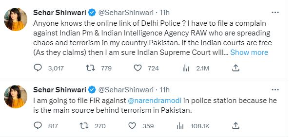 अभिनेत्री सहर शिवनारी ने ट्वीट कर कहा कि किसी को दिल्ली पुलिस का ऑनलाइन लिंक पता है? मुझे भारतीय प्रधानमंत्री और भारतीय खुफिया एजेंसी रॉ के खिलाफ शिकायत दर्ज करनी है, जो मेरे देश पाकिस्तान में अराजकता और आतंकवाद फैला रहे हैं. यदि भारतीय अदालतें स्वतंत्र हैं (जैसा कि वे दावा करते हैं) तो मुझे यकीन है कि भारतीय सर्वोच्च न्यायालय मुझे न्याय प्रदान करेगा.