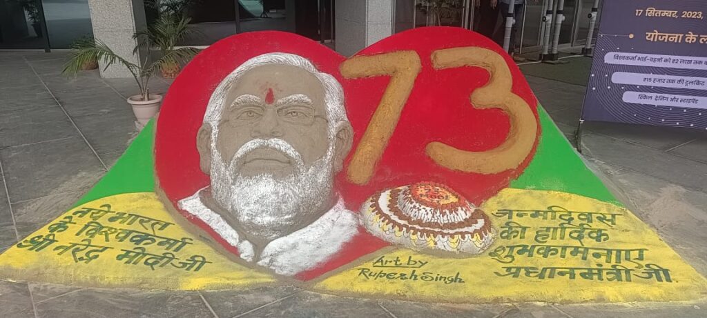 प्रधानमंत्री नरेंद्र मोदी के संसदीय क्षेत्र वाराणसी के रुद्राक्ष कन्वेंशन सेंटर में सेंड आर्टिस्ट रूपेश सिंह ने पीएम मोदी को जन्मदिन को अपनी कला से बधाई दिया। रूपेश सिंह ने पीएम मोदी की बेहद ही आकर्षित तस्वीर रेत पर उकेर पीएम मोदी को बधाई दिया। रेत पर प्रधानमंत्री नरेंद्र मोदी की तस्वीर लोगो को काफी आकर्षित किया। रेत पर बने पीएम मोदी के तस्वीर के साथ लोगो ने खूब सेल्फी ली।