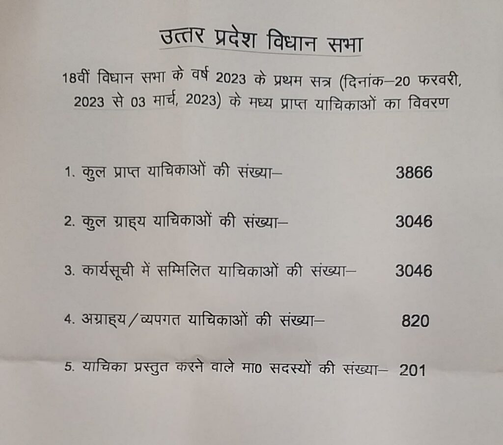 जिसमें कुल ग्राह्य याचिकाओं की संख्या 3046, कार्य सूची में शामिल याचिकाओं की संख्या 3046, आग्रह्य/ व्यपगत 820 व याचिका प्रस्तुत करने वाले सदस्यों की संख्या 201 रही. विधानसभा अध्यक्ष सतीश महाना द्वारा मिली जानकारी के मुताबिक इस दौरान सदन में 83 घंटे 38 मिनट तक कार्यवाही चली.