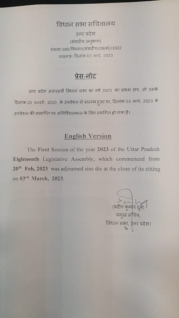 भारत समाचार डेस्क (लखनऊ)- यूपी की 18वीं विधानसभा 2023 की प्रथम कार्यवाही 20 फरवरी से 3 मार्च तक चलने के बाद अनिश्चितकाल के लिए स्थगित हो गई. इस दौरान कुल 3866 याचिकाएं सदन के पटल पर रखीं गईं.