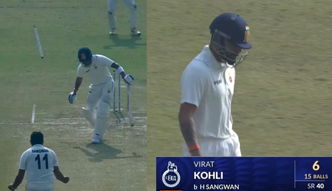 विराट की पारी की शुरुआत काफी शानदार रही। जैसे ही वह मैदान में उतरे, उन्होंने एक शानदार कवर ड्राइव खेलते हुए चौका मारा, जिससे स्टेडियम में मौजूद दर्शकों में खुशी की लहर दौड़ गई। ऐसा लग रहा था कि कोहली फॉर्म में वापस आ गए हैं और आज वह कुछ बड़ा करने वाले हैं। लेकिन यह खुशी बहुत देर तक नहीं रही। हिमांशु सागवान की गेंद ने विराट को धोखा दे दिया और वह बोल्ड हो गए। जैसे ही कोहली आउट हुए, पूरे स्टेडियम में सन्नाटा छा गया। उनके फैंस मायूस हो गए और धीरे-धीरे स्टेडियम से बाहर जाने लगे।