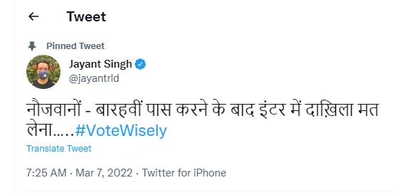 लखनऊ: आखिरी चरण का मतदान सुबह 7 बजे शुरू हो गया सभी राजनितिक दल जनता से वोट करने की अपील कर रहें हैं. इसी क्रम में राष्ट्रीय लोक दल के प्रमुख जयंत चौधरी ने सभी से मतदान करने की अपील की. ट्वीट करते हुए लिखा कि सभी मतदान करें वहीं भाजपा पर तंज कसते हुए जयंत ने कहा किनौजवानों – बारहवीं पास करने के बाद इंटर में दाख़िला मत लेना.