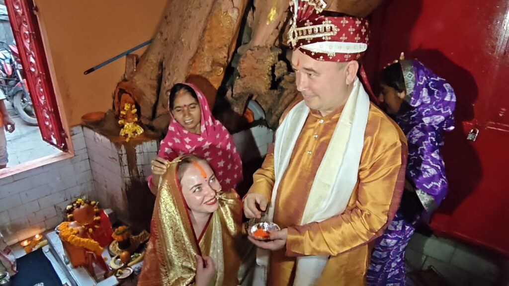 वाराणसी के दशाश्वमेध घाट किनारे स्थित मंदिर में रशिया से आए कॉन्स्टेंट और मरीन ने हिन्दू धर्म के अनुसार विवाह किया। उन्होंने बताया कि वह रशिया में व्यापारी है और भारत घूमने आए थे। काशी में पहुंच उन्हें सनातन धर्म के करीब आने का मौका मिला और महादेव के बारे में जानकारी ली। सनातन धर्म से वह इतने प्रभावित हुए कि रशियन दंपत्ति ने हिन्दू रीति रिवाज से शादी करने की इच्छा काशी के ब्राह्मण से किया। काशी के ब्राह्मण शिवाकांत पांडे ने उनका विवाह वैदिक रीति रिवाज से दशाश्वमेध घाट स्थित मंदिर में करवाया। दोनों दंपत्तियों ने हिन्दू रीति रिवाज से शादी कर काफी खुश नजर आए। वहीं अपने रशिया में मौजूद परिजनों को यह पूरी शादी को ऑनलाइन माध्यम से दिखाया। शादी के जोड़े में दुल्हन बनी मरीन ने बताया कि घर के परिजन भी हिन्दू संस्कृति से शादी करने में सहयोग किया और वह ऑनलाइन माध्यम से पूरी परंपरा को देखा। वहीं हिन्दू रीति रिवाज से शादी कर उन्हें एक अलग ही अनुभूति हो रही है।