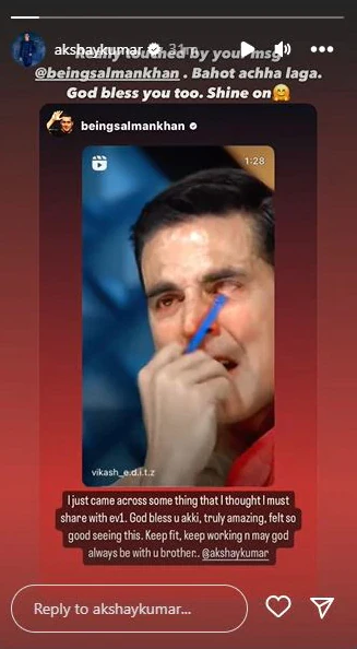 इसके बाद अक्षय ने भी प्यारा इस पर अपना प्यारा सा जबाब देते हुए इस वीडियो को फिर से अपनी इंस्टा स्टोरी पर लगाया और लिखा कि आपके सन्देश से बहुत अच्छा लगा, @Beingsalmankhan…बहुत अच्छा लगा, भगवान आपको आशीर्वाद दे। अंत में उन्होंने हग करने वला इमोजी भी बनाया हैं।