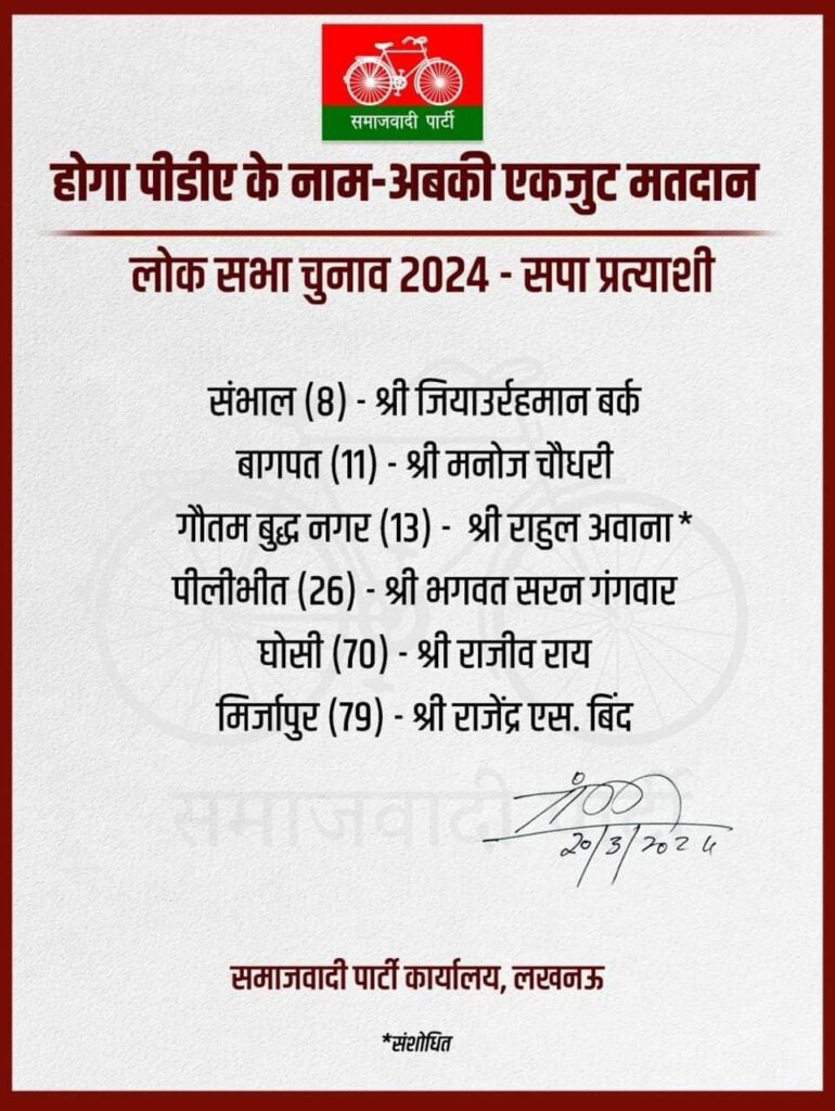 समाजवादी पार्टी ने बुधवार को अपना छठा लिस्ट जारी कर दिया है। पार्टी ने संभाल से जियाउर्रहमान बर्क, बागपत से मनोज चौधरी, गौतम बुद्ध नगर से राहुल अवाना, पीलीभीत से भगवत सरन गंगवार, घोसी से राजीव राय और मिर्जापुर लोकसभा सीट से राजेंद्र एस. बिंद को मैदान में उतारा है।