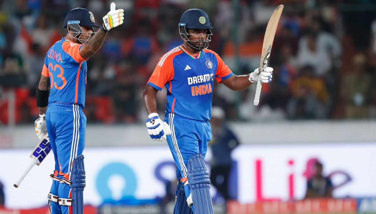 भारत-बांग्लादेश के बीच तीसरा और आखिरी T20 मुकाबला राजीव गांधी क्रिकेट स्टेडियम में खेला जा रहा है। जहां भारतीय बल्लेबाजों ने धुआंधार बल्लेबाजी की। संजू और कप्तान सूर्य कुमार यादव ने छक्के चौकों की बरसात करते हुए बांग्लादेशी गेंदबाजों को घुटने टेकने पर मजबूर कर दिया। वहीं संजू सैमसन ने शतकीय पारी खेलते हुए एक कीर्तिमान गढ़ दिया है।