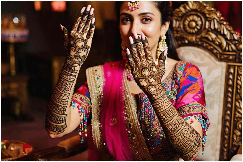 फ्लोरल बेल डिज़ाइन इस बार सबसे ज़्यादा पसंद की जा रही है। इसमें जालदार पैटर्न, मांडला आर्ट और फूलों की बेल का ऐसा मेल है जो एक नई नवेली दुल्हन से लेकर कॉलेज गर्ल तक हर किसी के हाथों को आकर्षक बनाता है। यह डिज़ाइन हाथों को भरावदार भी दिखाता है और पारंपरिक स्पर्श भी देता है।