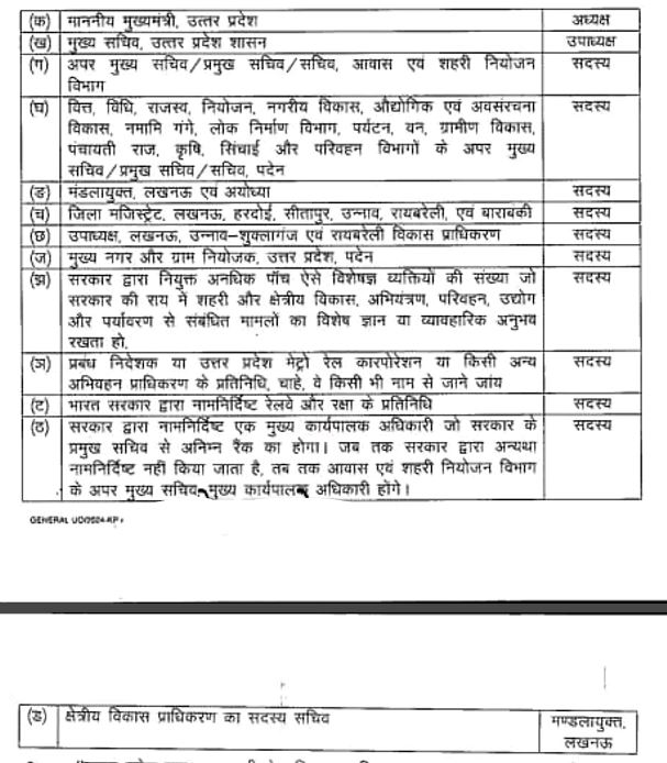 पूर्वोक्त अध्यादेश में धारा 4 की उपधारा 1 के अधीन शक्तियों का प्रयोग करके, राज्यपाल अग्रतर उक्त अध्यादेश के प्रयोजन के लिए उपरोल्लिखित “उत्तर प्रदेश राज्य राजधानी क्षेत्र” के संबंध में एक प्राधिकरण का गठन करते हैं, जिसे “उत्तर प्रदेश राज्य राजधानी क्षेत्र विकास प्राधिकरण” कहा जाएगा, जिसमें निम्नलिखित समाविष्ट होंगे :-