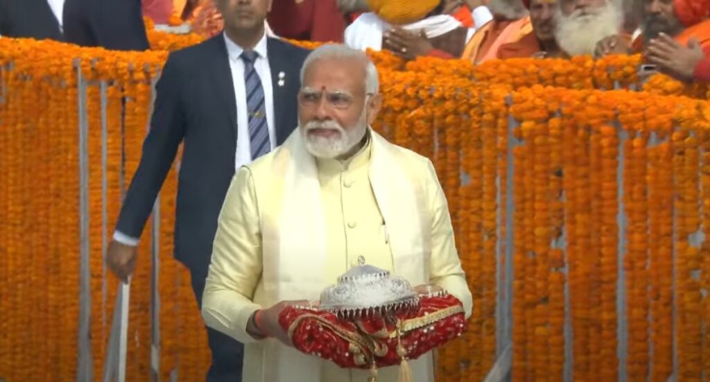 रामलला का चांदी का छत्रप लेकर प्राण प्रतिष्ठा के लिए जाते हुए पीएम मोदी।