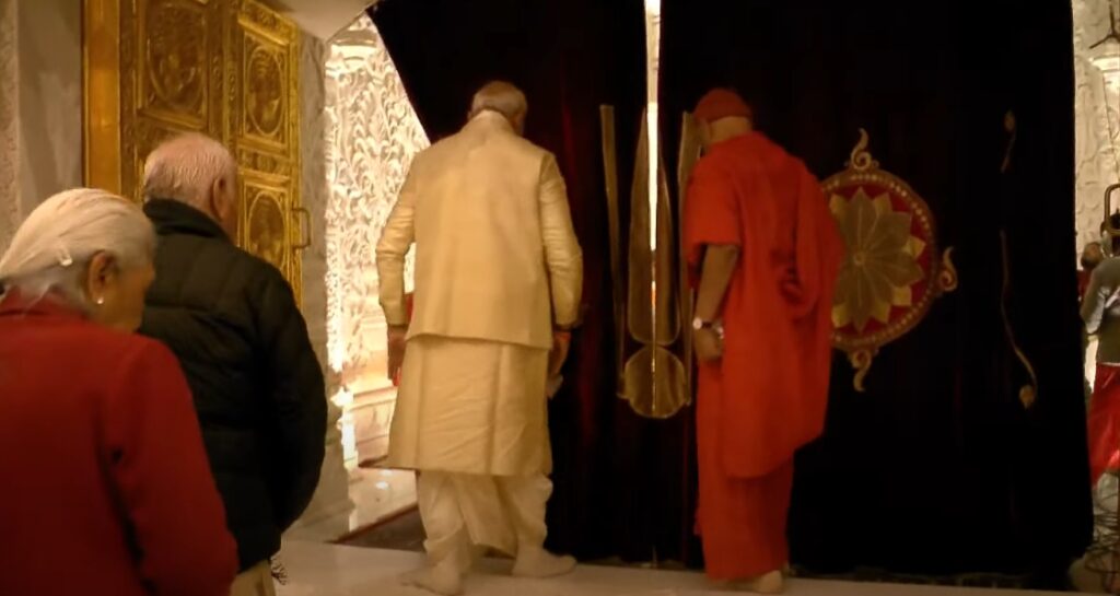 पीएम मोदी, राज्यपाल आनंदीबेन पटेल, सरसंघ संचालक मोहन भागवत और सीएम योगी रामलला के गर्भगृह में जाते हुए।
