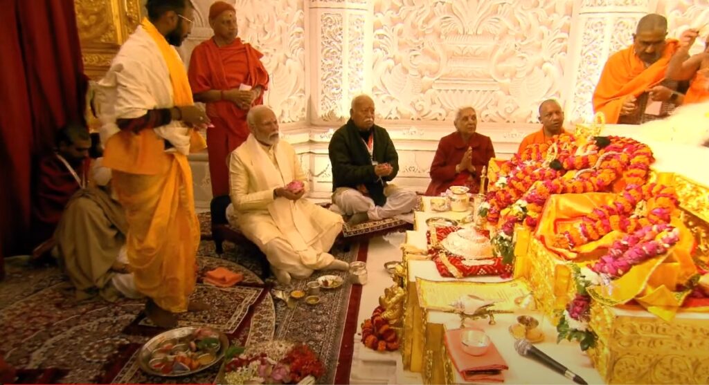 रामलला के भव्य और दिव्य स्वरूप का पूजन करते हुए पीएम मोदी राज्यपाल आनंदीबेन पटेल, सरसंघ संचालक मोहन भागवत और सीएम योगी।