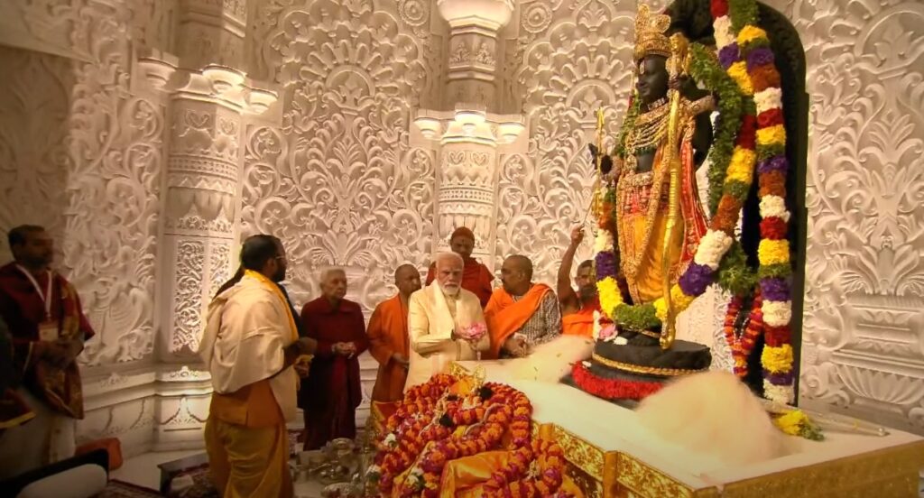 Ram Mandir: गर्भगृह में वैदिक मंत्रोच्चार के साथ रामलला का प्राण प्रतिष्ठा हो चुकी है। यह शुभ कार्य पीएम मोदी के हाथो किया गया। इसके बाद रामलला की प्रतिमा की आरती की गई। इस दौरान गर्भगृह में पीएम मोदी, मोहन भागवत मौजूद रहे। जबकि मुख्य यजमान पीएम मोदी के अलावा अतिथियों ने भी आरती की। यहां 10 जीवंत तस्वीरों के माध्यम से प्राण प्रतिष्ठा के दौरान मोदी की भक्ती, पूजा और अनुष्ठान दिखाएंगे।