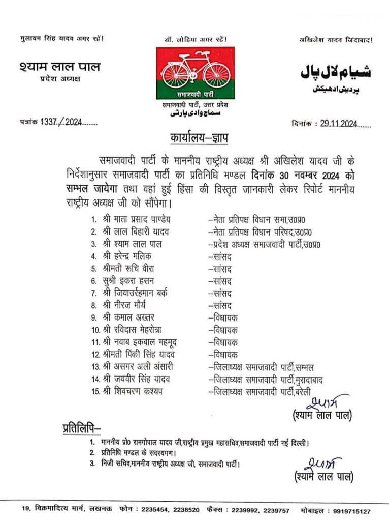 Lucknow : समाजवादी पार्टी (सपा) का एक प्रतिनिधिमंडल 30 नवंबर को संभल जिले में हुई हालिया हिंसा का जायजा लेने जाएगा। इस प्रतिनिधिमंडल का नेतृत्व नेता प्रतिपक्ष माता प्रसाद पांडे करेंगे। उनके साथ विधान परिषद में नेता प्रतिपक्ष लाल बिहारी यादव, पांच सपा सांसद और चार विधायक भी शामिल होंगे।