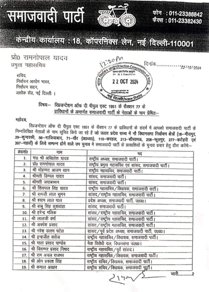 उपचुनाव की तैयारियों के मद्देनजर समाजवादी पार्टी ने 19 स्टार प्रचारकों की सूची जारी कर दी है। इस सूची में सपा मुखिया अखिलेश यादव, शिवपाल यादव, अवधेश प्रसाद, जया बच्चन, लालजी वर्मा, राम अचल राजभर, हरेंद्र मलिक, इंद्रजीत सरोज, श्याम लाल पाल, माता प्रसाद पाण्डेय, ओम प्रकाश सिंह, कमाल अख्तर, डिंपल यादव, विशंभर प्रसाद, बाबू सिंह कुशवाहा, राम जी लाल सुमन,श्याम लाल पाल