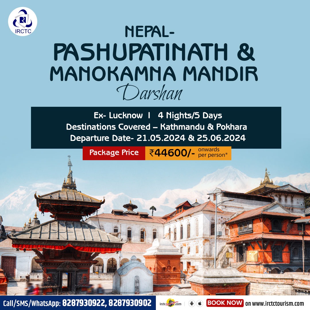 गर्मियों की छुट्टियों को देखते हुए IRCTC क्षेत्रीय कार्यालय, लखनऊ द्वारा नेपाल हवाई टूर पैकेज लखनऊ से पशुपतिनाथ (नेपाल) के लिये हवाई टूर ऑफर देने जा रहा है। यह ऑफर 25 से 29 जून  तक संचालित किया जायेगा। 04 रात्रि/05 दिनों  के इस यात्रा में यात्रियों को फ्लाइट से लखनऊ से काठमांडू एवं लखनऊ वापसी यात्रा की व्यवस्था की गई है। साथ ही काठमांडू से पोखरा की यात्रा भी हवाई माध्यम से कराई जाएगी एवं वापसी की यात्रा बस द्वारा करायी जायेगी।