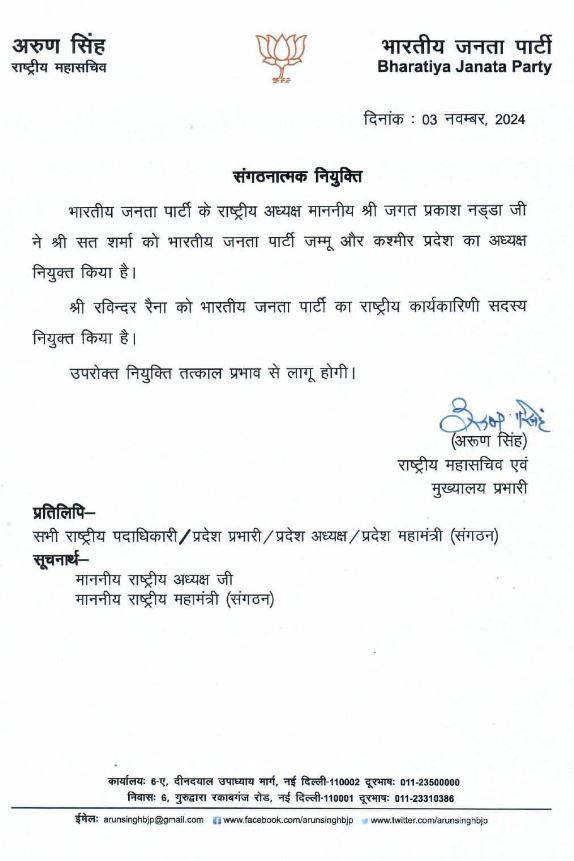 भारतीय जनता पार्टी ने जम्मू-कश्मीर इकाई के अध्यक्ष के लिए सत शर्मा को चुना है। उन्हें पूर्व प्रदेश अध्यक्ष रवींद्र रैना की जगह पर चुना गया है। दरअसल, नौशेरा विधानसभा सीट से चुनाव हारने पर रवींद्र रैना ने पार्टी की राज्य इकाई के अध्यक्ष पद से इस्तीफा दे दिया था। वहीं अब पार्टी ने रैना को बीजेपी राष्ट्रीय कार्यकारिणी का सदस्य बनाया है। इस बात का ऐलान बीजेपी राष्ट्रीय महासचिव अरूण सिंह की ओर से प्रेस रिलीज जारी कर किया गया है।