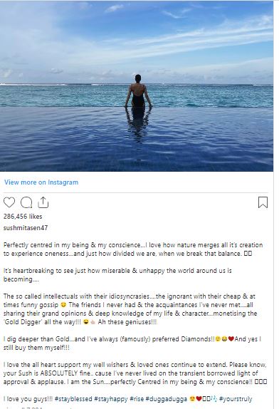 सुष्मिता सेन तब से लगातार सुर्खियां बटोर रही हैं जब से आईपीएल के संस्थापक ललित मोदी ने घोषणा की कि वह अभिनेत्री के साथ रिश्ते में हैं। दिवा के साथ कुछ तस्वीरें साझा करते हुए, ललित ने चीजों को आधिकारिक कर दिया था। हालांकि, इस घोषणा के बाद सुष्मिता को लगातार ट्रोल किया जा रहा है और कई लोग उनके लिए ‘गोल्ड डिगर’ शब्द का इस्तेमाल कर रहे हैं। अपने नवीनतम इंस्टाग्राम पोस्ट में, अभिनेत्री ने उसी पर प्रतिक्रिया दी है।