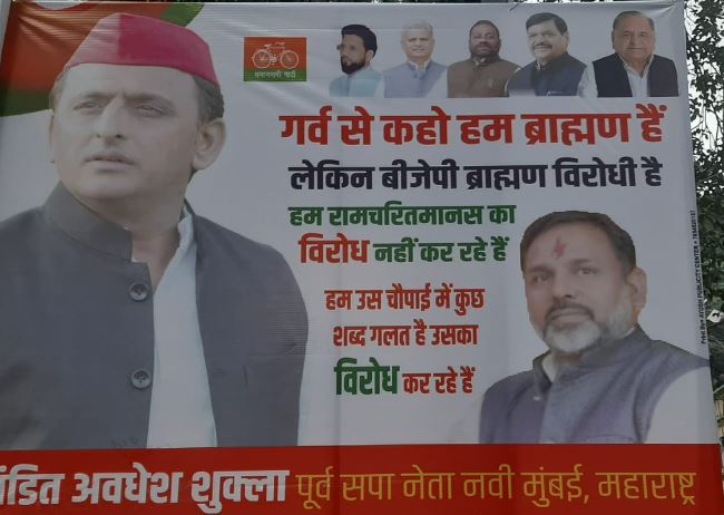 अब शनिवार को एक और पोस्टर समाजवादी पार्टी कार्यालय के बाहर लगाया गया है। जिसको सपा के पूर्व नेता पंडित अवधेश शुक्ला ने लगवाया है। पोस्टर में लिखा गया है कि गर्व से कहो हम ब्राह्मण हैं लेकिन बीजेपी ब्राह्मण विरोधी है। पोस्टर में आगे लिखा गया है कि हम रामचरितमानस का विरोध नहीं कर रहे हैं हम उस चौपाई में लिखे गलत शब्दों का विरोध कर रहे हैं।