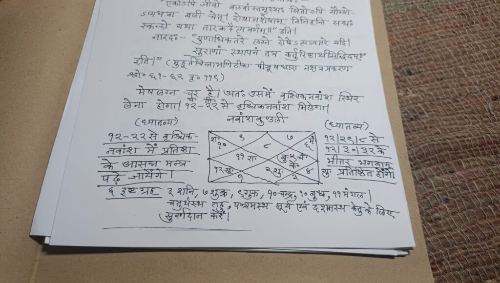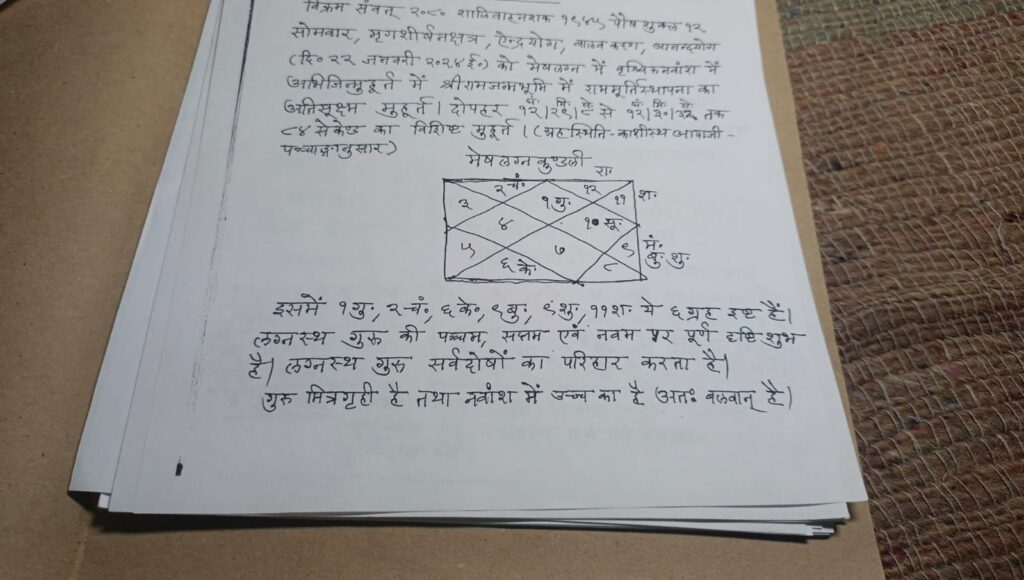 22 जनवरी को दोपहर 12.15 से 12.45 के बीच मुख्य यजमान पीएम नरेंद्र मोदी के हाथों होगी, श्री रामलला की प्राणप्रतिष्ठा पूजन होगा। जो मेष लग्न और अभिजीत मुहूर्त में संपन्न होगा विद्वानों के अनुसार मेष लग्न,वृश्चिक नवांश में रामलला का प्राण प्रतिष्ठा होनी है, मेष लग्न में गुरू है और पांचवे, सातवे और नवे ग्रह में पूर्ण दृष्टि है। वही 12 बजकर 29 मिनट 8 सेकेंड से 12 बजकर 30 मिनट 32 तक यानी 8 सेकेंड का विशेष मुहूर्त है, जिसमे रामलला विराजमान होंगे।