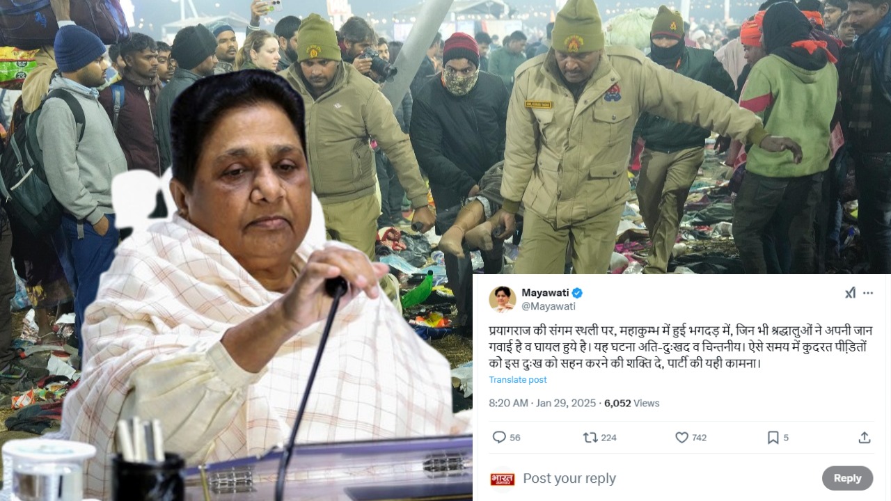 मायावती ने अपने पोस्ट में लिखा कि प्रयागराज की संगम स्थली पर, महाकुम्भ में हुई भगदड़ में, जिन भी श्रद्धालुओं ने अपनी जान गवाई है व घायल हुये है। यह घटना अति-दुःखद व चिन्तनीय। ऐसे समय में कुदरत पीडि़तों को इस दुःख को सहन करने की शक्ति दे, पार्टी की यही कामना।