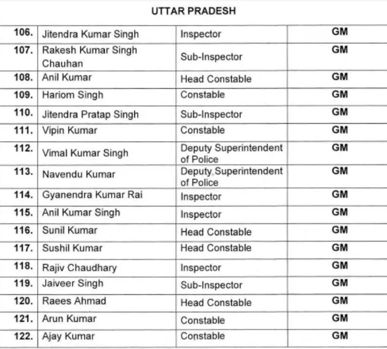 वहीं, सराहनीय सेवा के लिए पदक पाने वालों के नाम में मनोज कुमार सोनकर, उप महानिरीक्षक, प्रदीप गुप्ता, उप महानिरीक्षक, आलोक प्रियदर्शी, पुलिस अधीक्षक, आरआई ब्रिजेश केआर श्रीवास्तव, पुलिस अधीक्षक, प्रदेश केशव चंद गोस्वामी, पुलिस अधीक्षक, डॉ.. महेंद्र पाल सिंह, पुलिस उपायुक्त, कुंवर ज्ञानंजय सिंह, पुलिस उपायुक्त, डॉ. राजीव दीक्षित, पुलिस अधीक्षक, कमलेश बहादुर, अपर पुलिस अधीक्षक, विश्वजीत श्रीवास्तव, अपर पुलिस अधीक्षक, सुरेन्द्र नाथ तिवारी, पुलिस अधीक्षक, चिरंजीव नाथ सिन्हा, अपर पुलिस अधीक्षक पुलिस, विद्या सागर मिश्रा, पुलिस उपायुक्त, मो. इरफान अंसारी, अपर पुलिस अधीक्षक, शाहनवाज हुसैन, उप पुलिस अधीक्षक, राजेश तिवारी, उप पुलिस अधीक्षक शामिल है।