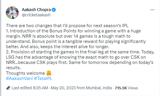 आईपीएल में बदलाव को लेकर चोपड़ा ने ट्वीट कर BCCI को अपनी राय दी है. अपने ट्वीट में उन्होंने लिखा, ‘अगले सत्र के IPL के लिए मैं दो बदलावों का प्रस्ताव रखता हूं. पहला बड़े अंतर से गेम जीतने वाली टीम को बोनस प्वॉइंट्स मिलने चाहिए. एनआरआर पूर्ण है लेकिन 14 से अधिक गेम समझने के लिए एक कठिन गणित है. बोनस अंक काफी बेहतर खेलने के लिए एक ठोस इनाम है. साथ ही रुचि को लंबे समय तक जीवित रखता है. अंतिम चरण में खेलों को एक ही समय पर शुरू करने का प्रावधान आज, एलएसजी को एनआरआर पर सीएसके पर जाने के सटीक गणित को जानने का फायदा है… क्योंकि सीएसके पहले खेलती है. कल के लिए वही आज के परिणामों पर निर्भर करता है.
