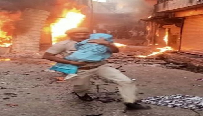 तस्वीर में कांस्टेबल नेत्रेश शर्मा एक बच्चे को गोद में लिए दौड़ता हुआ दिखाई दे रहे है और उनके आसपास के घर जल रहे हैं। दरअसल, दंगाइयों ने इलाके के कुछ घरों में आगजनी कर दी थी इस दौरान राजस्थान पुलिस के कांस्टेबल नेत्रेश शर्मा की नजर एक बच्चे पर पड़ी जिसे बचाने के लिए उन्होंने उसे अपनी गोद में उठाया और लेकर दौड़ पड़े।