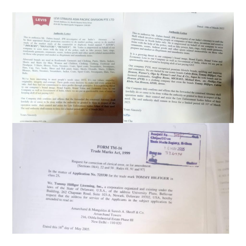 Levis, PVH और Tommy hilfiger के फर्जी अथॉरिटी लेटर मिले।