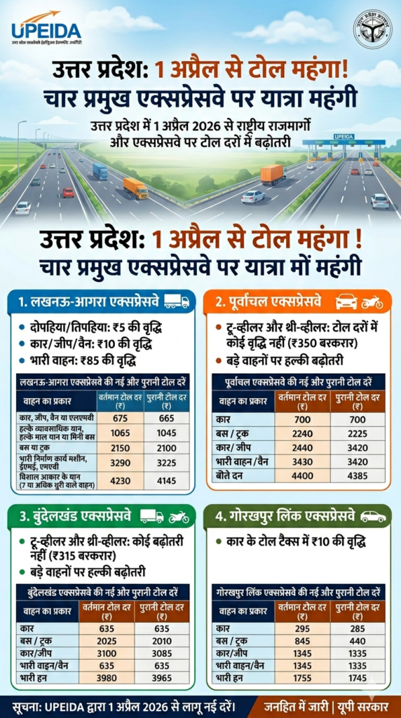 1 अप्रैल 2026 से उत्तर प्रदेश के चार प्रमुख एक्सप्रेसवे पर यात्रा महंगी हो गई है, जिससे यात्रियों को अपने यात्रा बजट में बदलाव करना पड़ेगा।