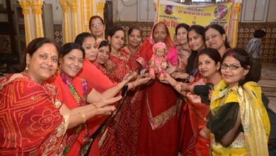 जैन धर्म के 24 वें तीर्थंकर जन्म कल्याणक के उपलक्ष्य में महिलाओ ने ढोलक थाप व मजीरे धुन पर नृत्य कर बधाई के साथ झुलाया पालना