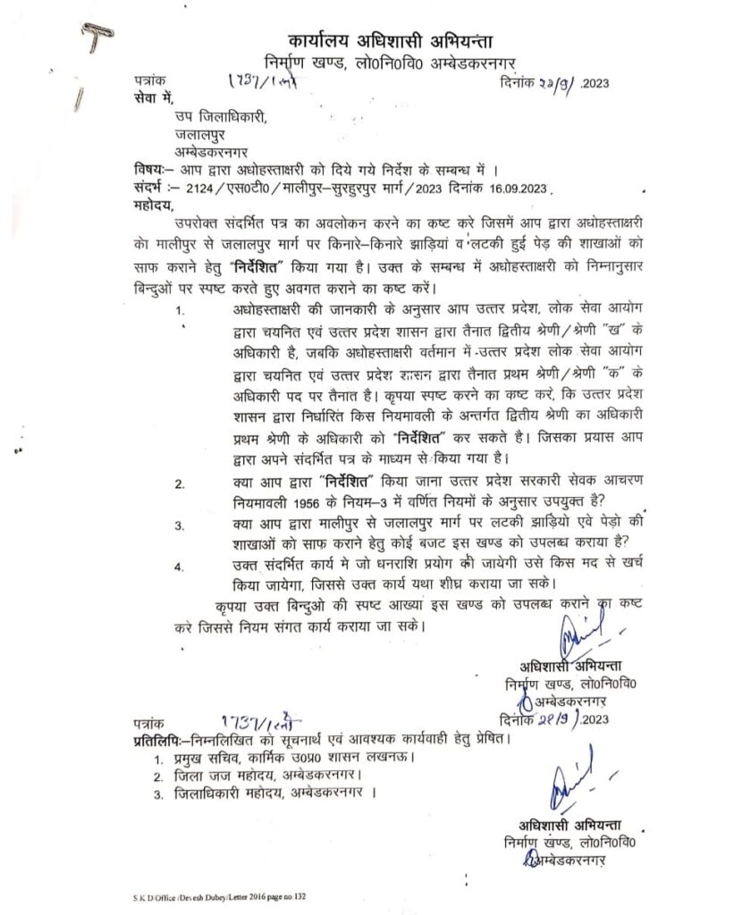 अंबेडकरनगर से एक ऐसा विवाद सामने आया है जिसे पढ़ आप भी हैरान हो जायेगे दरअसल सिविल सेवा और इंजीनियरिंग सेवा के दो अफसरों के बीच एक निर्देशित युद्ध काफी चर्चा का विषय बना हुआ है। आपको बता दें कि अंबेडकरनगर के जलालपुर SDM ने पीडब्ल्यूडी के इंजीनियर को पत्र भेजा पत्र में सड़क किनारे साफ़ सफाई और कटान के निर्देश दिए और जल्दी-जल्दी कार्य को पूरा हो ये सुनिश्चित किया जाये। बस SDM के निर्देश से इंजीनियर साहब को गुस्सा आ गया।