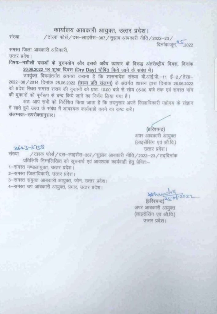आपको बता दें कि नशीली दवाओं के अवैध कारोबार के खिलाफ अंतर्राष्ट्रीय दिवस के अवसर इस बार ड्राई डे घोषित किया गया है. उत्तर प्रदेश सरकार ने युवाओं के बीच बढ़ते प्रचलन को देखते हुए प्रदेश में कल ड्राई डे घोषित किया है.