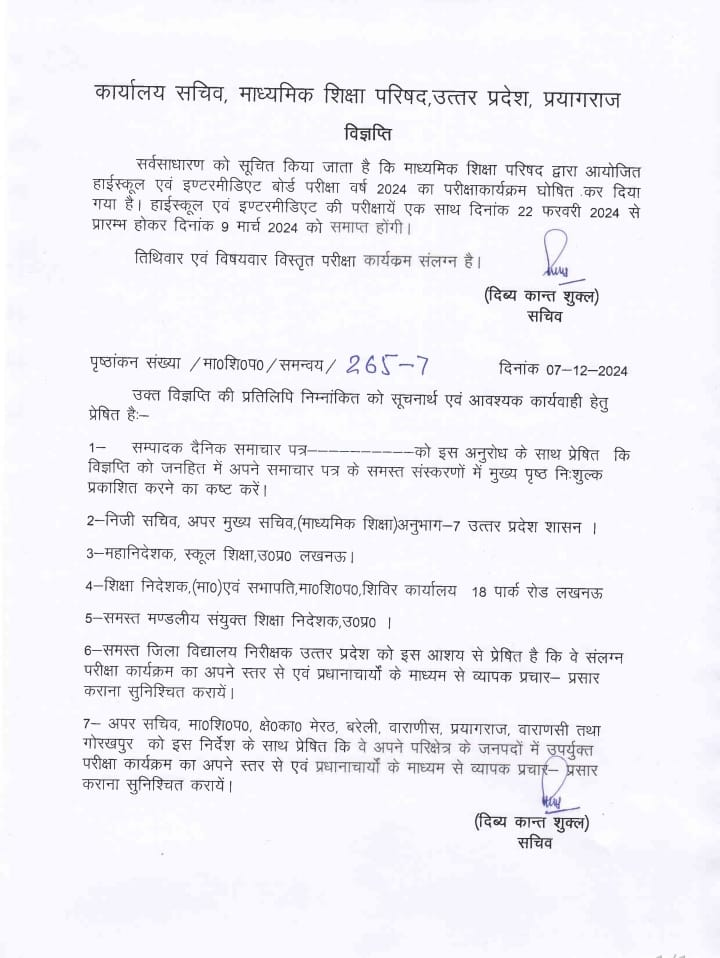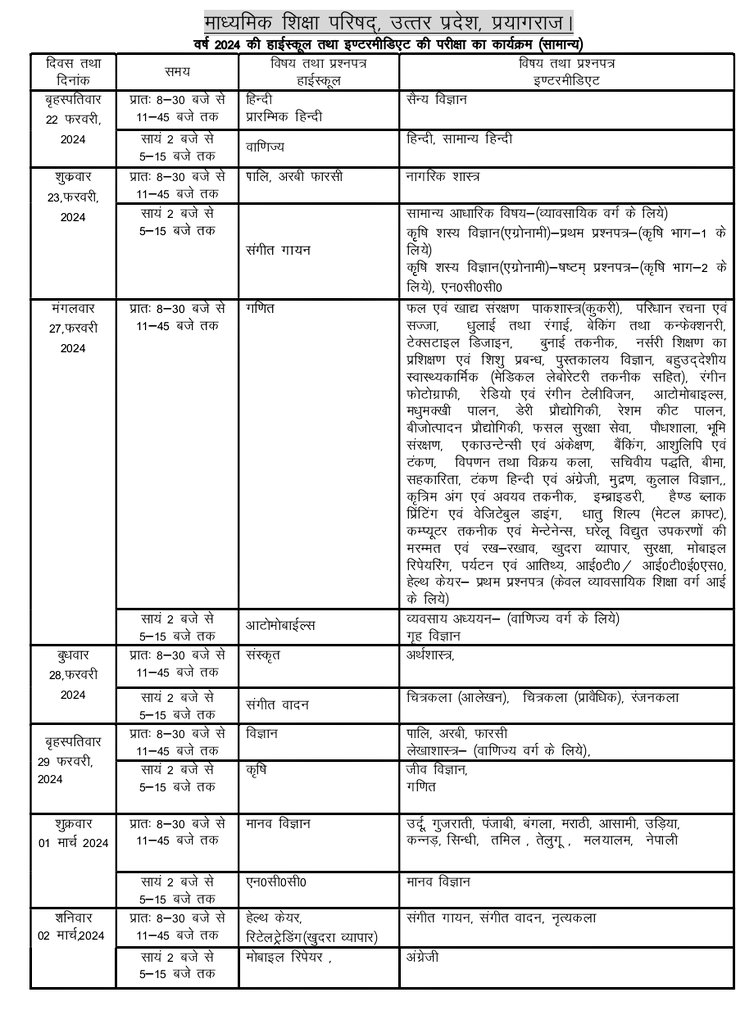 यूपी बोर्ड ने परीक्षा शेड्यूल जारी कर दिया है। 10वीं और 12वीं का परीक्षा शेड्यूल जारी हो गया है। बोर्ड परीक्षाएं 22 फरवरी से शुरु होकर 9 मार्च तक चलेंगी।