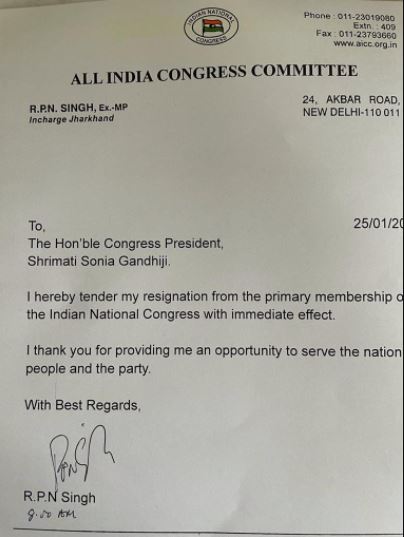 लखनऊ. यूपी विधानसभा चुनाव 2022 में एक महीने से कम का वक्त बचा है। यूपी में कांग्रेस को एक और बड़ा झटका लगने जा रहा है।। कांग्रेस के दिग्गज नेता एवं पूर्व केन्द्रीय मंत्री आरपीएन सिंह ने पार्टी से इस्तीफा दे दिया है। आरपीएन सिंह ने कांग्रेस की प्राथमिक सदस्यता से इस्तीफा दे दिया है। आरपीएन सिंह ने सोनिया गांधी को इस्तीफा भेज दिया है। RPN सिंह ने खुद इस बात की जानकारी दी है।