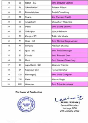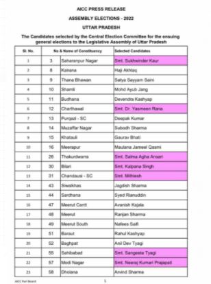 आपको बता दें, कांग्रेस ने 41 प्रत्याशियों की सूची जारी कर दी है। जिसमें सहारनपुर से सुखविंदर कौर को कांग्रेस का टिकट दिया गया है। स्याना से पूनम पंडित को कांग्रेस ने प्रत्याशी बनाया गया। कैराना से हाजी इखलाक,थाना भवन से सत्य श्याम सैनी, शामली से मो अयूब जंग,बुढ़ाना से देवेंद्र कश्यप प्रत्याशी,चरथावल से यासमीन राणा,पुरकाजी से दीपक कुमार, मुजफ्फनगर से सुबोध शर्मा,खतौली से गौरव भाटी, मीरापुर से जमील कासमी,ठाकुरद्वारा से सलमा आगा, बिलारी से कल्पना सिंह,चंदौली से मिथिलेश प्रत्याशी है।