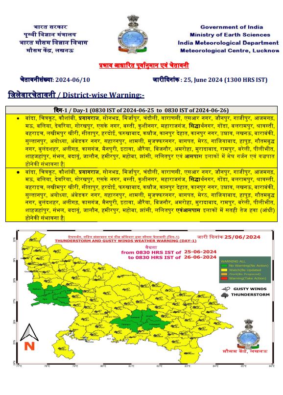 जिसके परिणामस्वरूप 26 जून से पूर्वी उत्तर प्रदेश जबकि 27 जून से पश्चिमी उत्तर प्रदेश में वर्षा के क्षेत्रफल एवं तीव्रता में वृद्धि के साथ कहीं-कहीं भारी वर्षा होने की संभावना भी जताई गई है। इसी क्रम में राजधानी लखनऊ में भी 26 जून के बाद वर्षा की तीव्रता में वृद्धि होने की संभावना है।