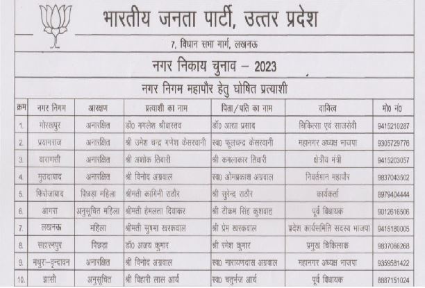 यूपी में नगर निकाय का चुनावी शंखनाद हो चुका है और प्रदेश के सभी सियासी दलों ने चुनाव के लिए कमर कस ली है। इसी क्रम में प्रदेश में सत्तारूढ़ दल बीजेपी ने भी मेयर प्रत्याशियों के नामों की पहली सूची जारी कर दी है।