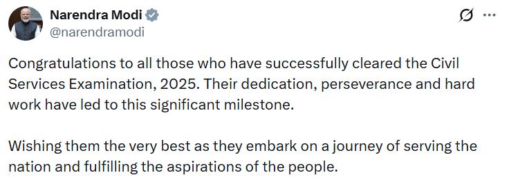प्रधानमंत्री नरेंद्र मोदी ने भी सिविल सेवा परीक्षा 2025 में सफल हुए सभी अभ्यर्थियों को बधाई दी। उन्होंने सोशल मीडिया प्लेटफॉर्म X पर पोस्ट करते हुए लिखा कि इन उम्मीदवारों की मेहनत, लगन और समर्पण ने उन्हें इस महत्वपूर्ण उपलब्धि तक पहुंचाया है। प्रधानमंत्री ने सफल अभ्यर्थियों को देश सेवा की नई जिम्मेदारी के लिए शुभकामनाएं दीं और कहा कि वे जनता की उम्मीदों पर खरा उतरें।